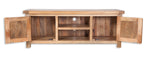Crafted from solid Mango wood with a natural mango wood finish, this TV unit boasts a 40mm thick top with rounded corners for a touch of refinement. The two cabinets and open shelf provide ample storage space, making it an ideal addition to your entertainment area.